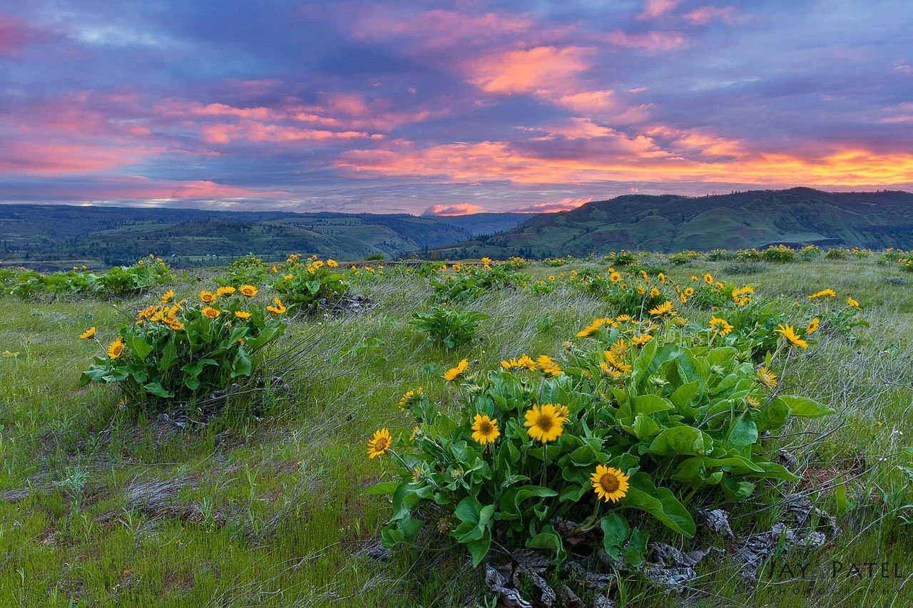 Field of yellow flowers with green leaves under a colorful sunset sky and rolling hills in the distance.